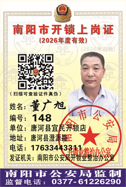 证号:148 董广旭 店名:唐河县宜民开锁店