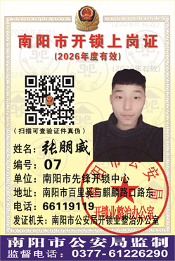 证号:07 张朋威 店名:南阳市先锋开锁中心 地址:南阳市百里奚与麒麟路丁字口路东 电话:66119119 所在的店因“能遵纪守法,诚信服务,合规经营,且证照齐全,群众口碑好”,2017年荣获南阳市公安局和开锁协会颁发的"优秀门店"匾牌。2020年荣获南阳市公安局和开锁协会颁发的“平安南阳贡献奖”、“放心开锁店”等荣誉称号匾牌。2025年被南阳市公安局和开锁协会评为“优秀锁匠”、门店被评为“合格开锁网点”。
