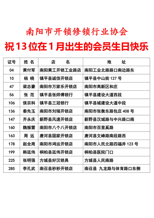 南阳市开锁修锁行业协会 祝13位在1月出生的会员生日快乐